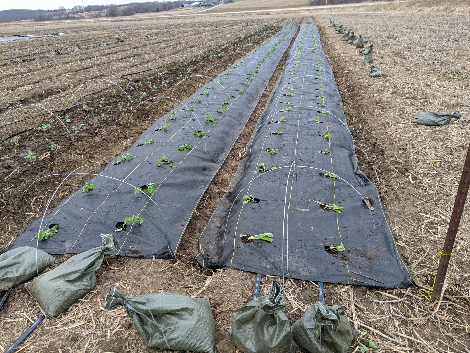 We stretch out some row cover off a roll and sand-bag it down. We've learned from the silage tarps that the correct quantity of sand-bags is always: a lot.